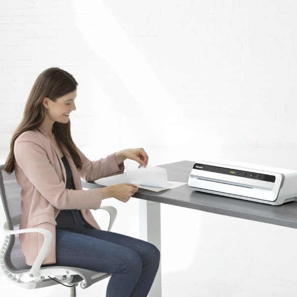 Système de plastification 100 % anti-bourrage : o Technologie avancée de suivi des pochettes avec inversion automatique, guides lumineux et grand plateau de sortie pliables pour un guidage parfait des pochettes du début à la fin