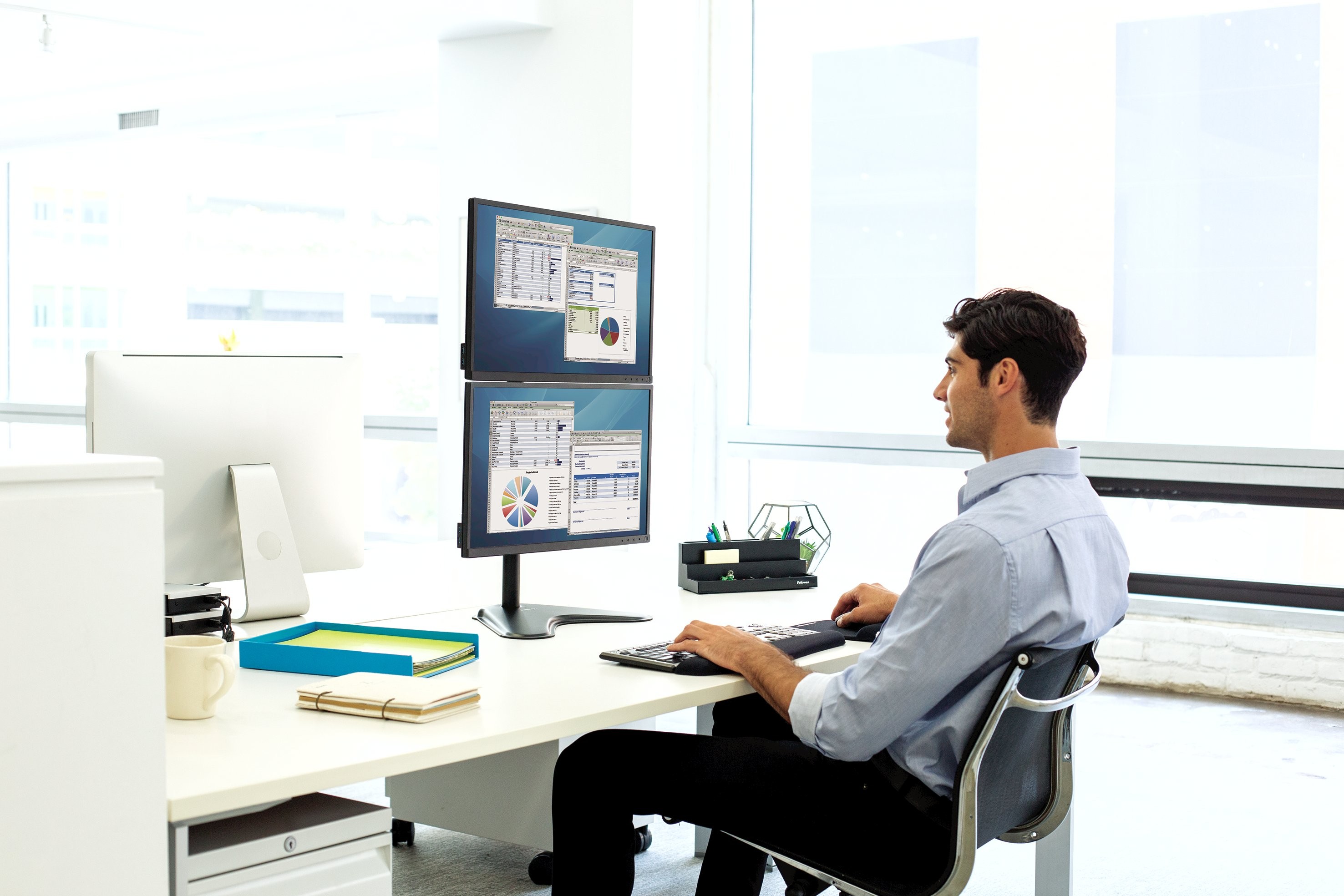 Créez un espace de travail productif et positionnez vos moniteurs pour réduire les tensions aux épaules ou au cou, ainsi que la fatigue oculaire