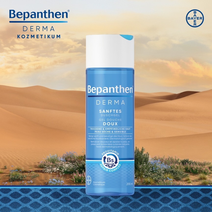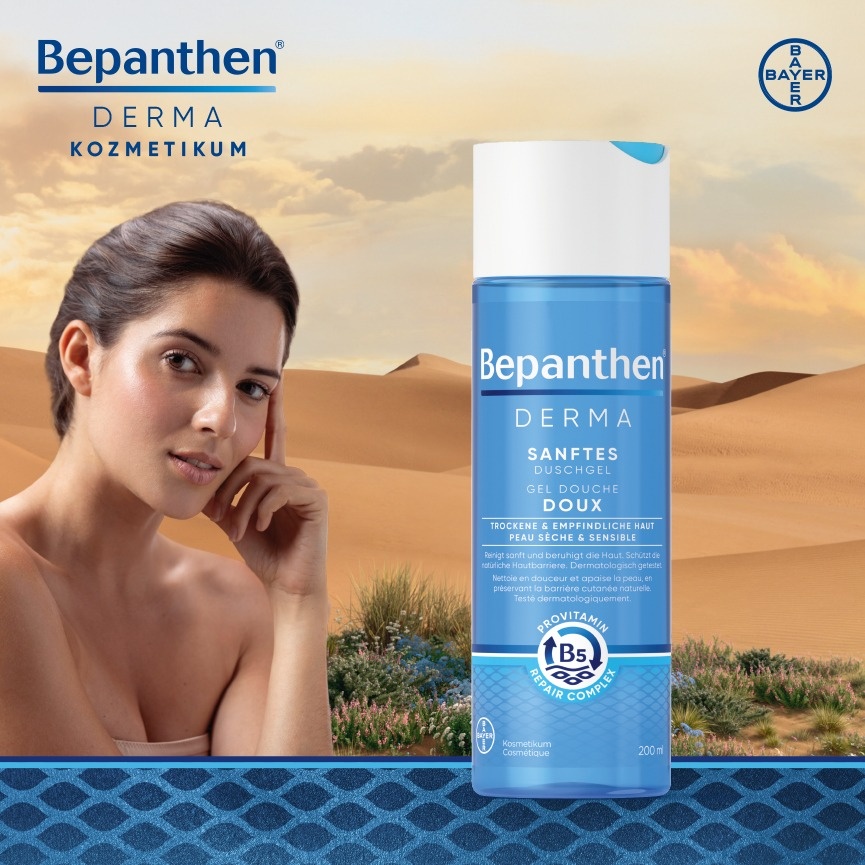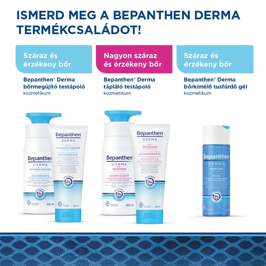 A Bepanthen® Derma egy dermokozmetikum termékcsalád B5-provitaminos tápláló-megújító komplexszel és mélyhidratáló hatással. Ezek a termékek kifejezetten a száraz, a nagyon száraz és érzékeny bőr hidratálására, illetve gyengéd tisztítására lettek kifejlesztve, bőrgyógyászatilag teszteltek és alkalmasak az egész család számára. Összetevőik legalább 90%-ban természetes eredetűek. Tartós hidratálást biztosítanak, és már az első használattól kezdve nyugtatják a száraz, érzékeny bőrt.