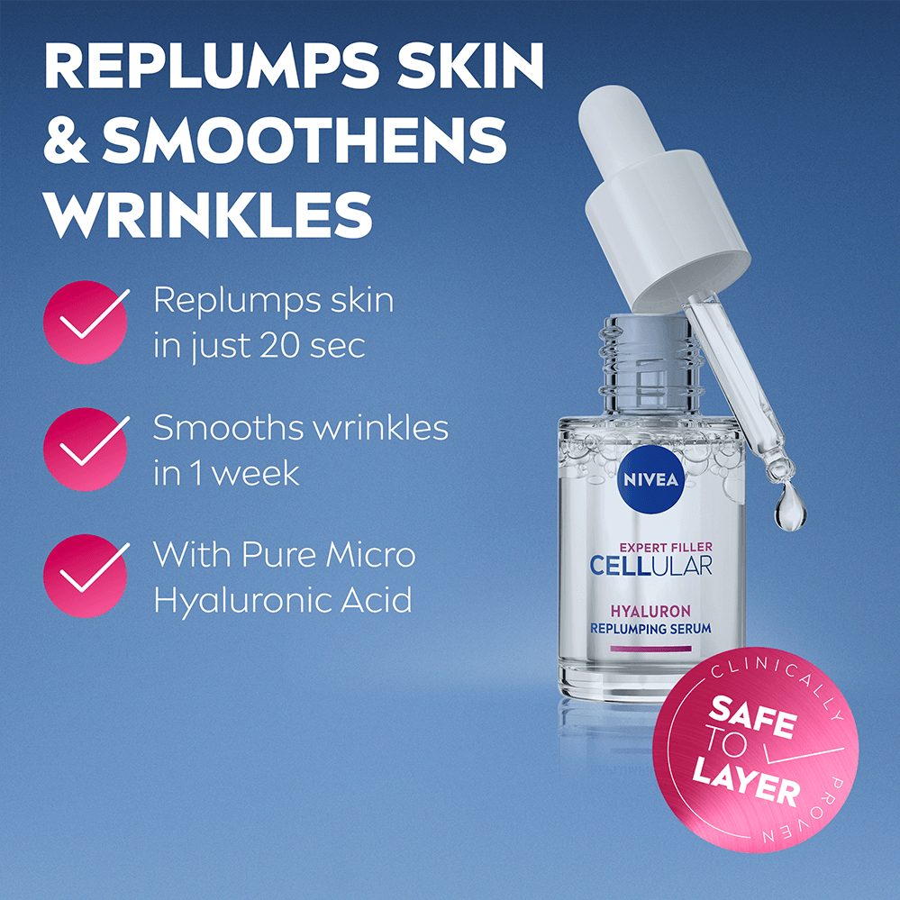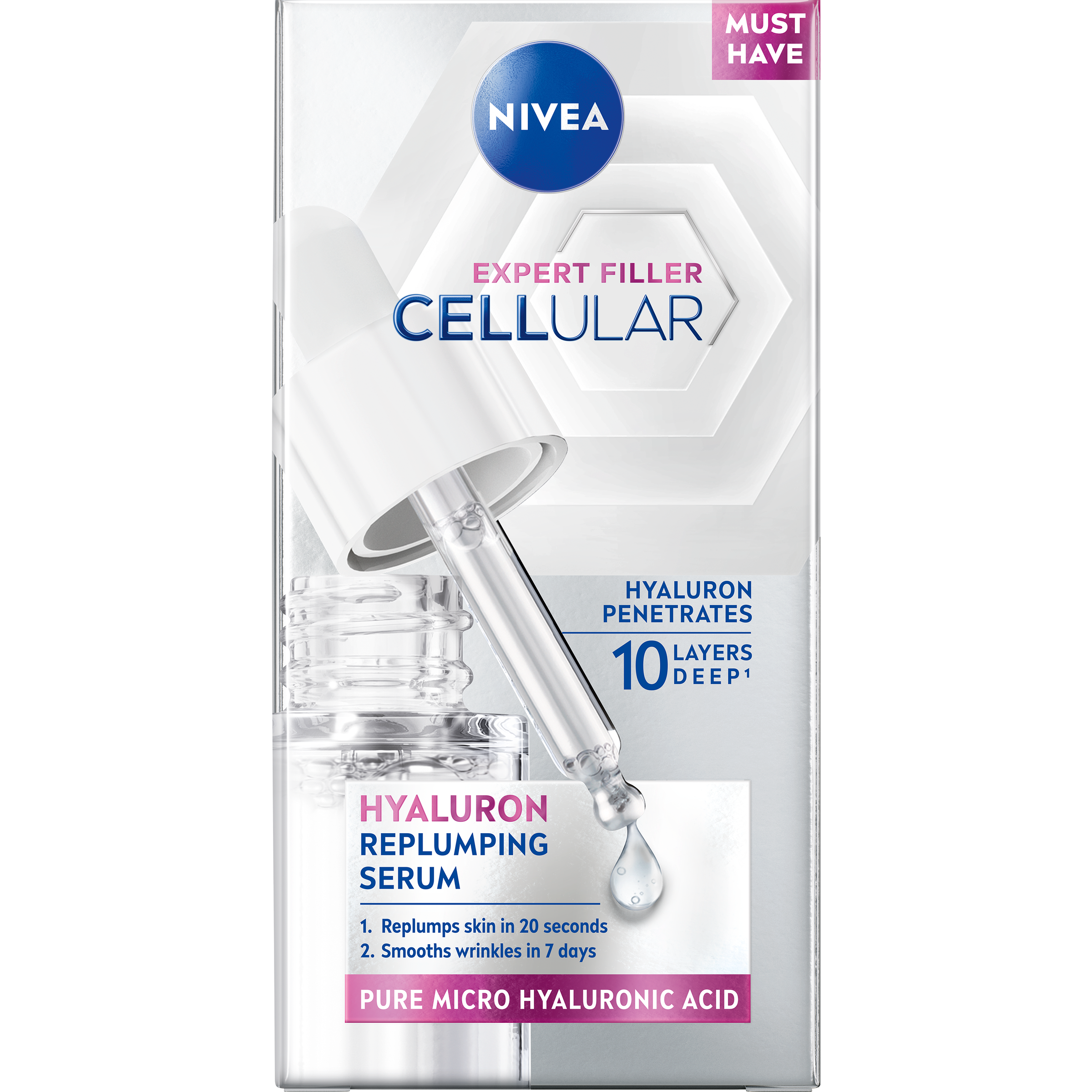 A 40-szer kisebb molekulák* mélyen behatolnak a bőrbe és 20 másodperc alatt feltöltik a bőrt, 1 hét alatt pedig kisimítják a finom vonalakat és ráncokat is. Gyengéd a bőrhöz, minden bőrtípusra használható, beleértve az érzékeny bőrt is. Rétegezd bátran és alakítsd ki a saját arcápoló rutinod a NIVEA Cellular szérumokkal. Hidratált bőrt biztosít: NIVEA Cellular Expert Filler Hialuron Feltöltő Szérum 15 ml.