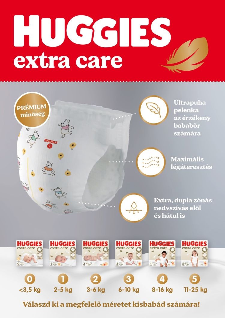 A HUGGIES Extra Care termékcsalád modern megjelenéssel és továbbfejlesztett tulajdonságokkal kínál maximális kényelmet és bőrvédelmet a pelenkás időszak során. Ezek a prémium kategóriás nadrágpelenkák hatékony védelmet nyújtanak az innovatív fejlesztéseknek köszönhetően.