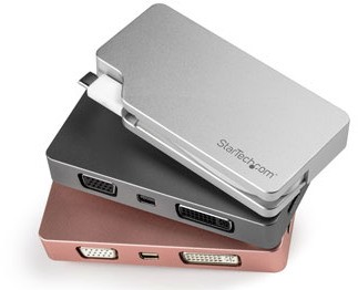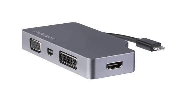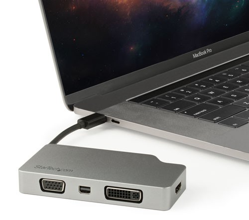 This USB-C multiport video adapter offers a portable solution for connecting your USB Type-C or Thunderbolt 3 computer to a VGA, DVI, HDMI® or Mini DisplayPort display.
