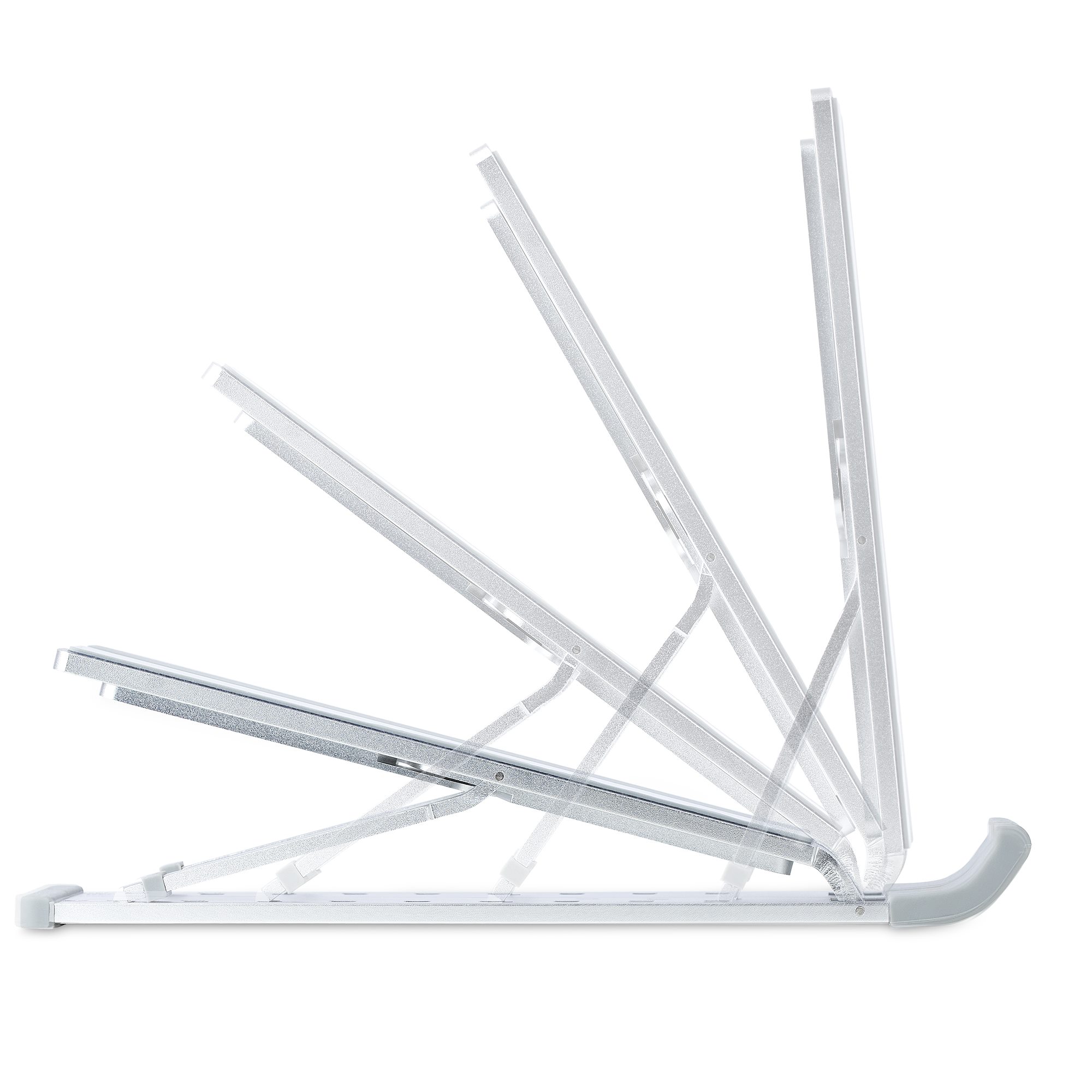 The ergonomic laptop stand features 9 different angle adjustments (15° / 27° / 37° / 45° / 52° / 60° / 67° / 75° / 84°) to help find the most comfortable viewing angle. The raised lip at the front and the anti-slip rubber pads prevent the laptop from shifting while making adjustments and during operation. In addition, the pads protect the mounted device from cosmetic damage.