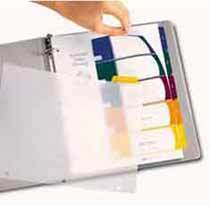 | For Table of Contents, simply print section titles on plain paper, three-hole punch and place the sheet behind translucent sheet | Two columns provide more printing space to identify tab sections | Sleeve won't lift print | Packaging bag made with 50% recycled material | Simply print the section titles onto the Table of Contents page | Available with preprinted tabs 1-5, 1-8, 1-10, 1-12, 1-15, 1-31 and Jan. - Dec. | Simply print the section titles onto the Table of Contents page | Each kit includes a Table of Contents page, a matching set of tab dividers, a binder cover page and spine inserts | Copper-reinforced holes provide extra tear resistance | |