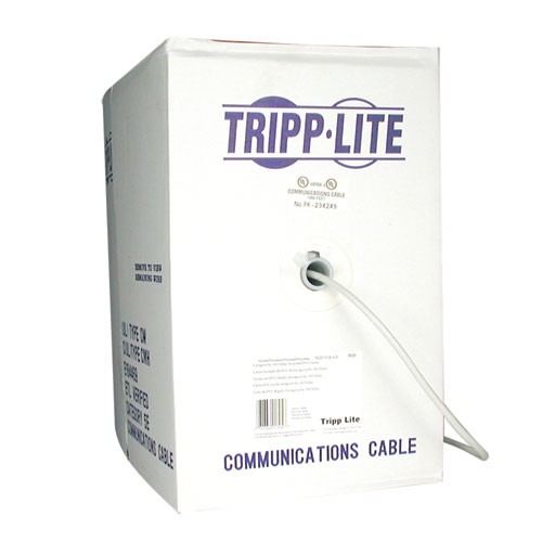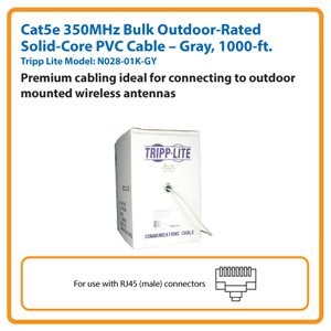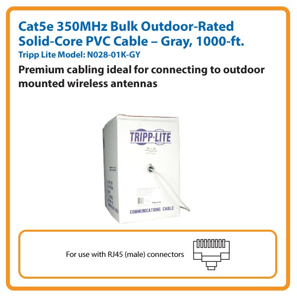 This 1000-ft. Tripp Lite Cat5e 350MHz Bulk Outdoor-Rated Solid-Core PVC Cable is the premium solution for long distance runs to outdoor wireless antennas. The N028-01K-GY operates in temperatures as low as -40°F (-40°C) and as high as 140°F (60°C).