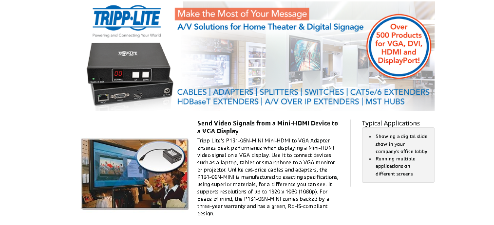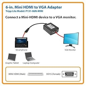 With no external power or drivers required, the P131-06N-MINI offers plug-and-play convenience. Simply plug it in, and you’re ready for action. All you need is a Mini HDMI-enabled device and a VGA display. Should you need auxiliary power, however, there is a built-in Micro-USB port for connecting a power adapter.