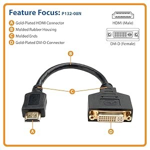 The eight-inch molded cable fits easily into a laptop bag or briefcase. It features premium foil and braid shielding to deliver top-of-the-line signal quality and protection from EMI/RFI interference. Gold-plated connectors with 24K gold contacts ensure excellent conductivity. Integral strain relief ensures the cable and connectors last a long time.