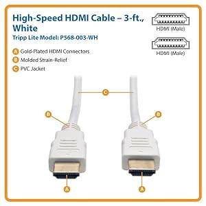 Manufactured using top-quality materials, the P568-003-WH creates a pure digital connection between HDMI-enabled digital display devices and HDMI-enabled digital source devices. The connectors are gold plated for optimal signal transfer. Premium double-shielding provides maximum EMI/RFI protection and impedance-matched twisted-pair construction reduces cross-talk and interference. The P568-003-WH has molded construction with integral strain-relief for durability and long life. A flexible PVC jacket makes the P568-003-WH easy to install, even in tight corners and other areas where space is restricted.