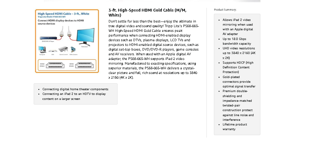 When you choose a genuine Tripp Lite cable, you get superior performance plus peace of mind. We’re so confident of the quality of our P568-003-WH HDMI cable that we warrant it to be free from defects in material and workmanship—for life! Additionally, the P568-003-WH is manufactured in compliance with strict RoHS specifications, reflecting Tripp Lite’s commitment to environmental responsibility.