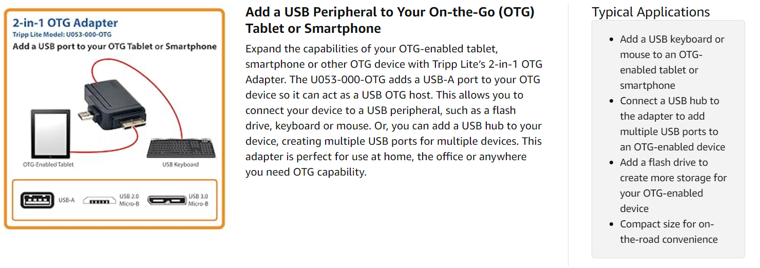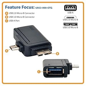 For ultimate compatibility with your different OTG devices, the U053-000-OTG has two male connectors: a USB 2.0 Micro-B and a USB 3.0 Micro-B. Now you can use the same adapter with different OTG devices. And, as you replace devices, you’ll have an adapter with both types of Micro-B connectors.