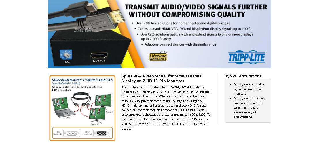 The P516-006-HR comes with a lifetime product warranty. It’s manufactured in compliance with strict RoHS specifications, reflecting Tripp Lite’s commitment to environmental responsibility.