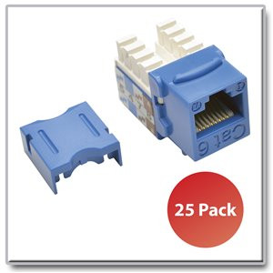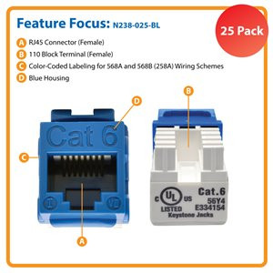 This convenient 25-pack of Tripp Lite’s Cat6/Cat5e 110-Style Punch-Down Keystone Jacks provides flexibility in Cat6 and Cat5e installations. The jacks feature a uniquely patterned printed circuit board that delivers Cat6 250 MHz performance. They also have dual color-coded labeling for both 568A and 568B (258A) wiring schemes. Jacks have a white housing and mount in conventional face plates, outlet boxes and panels.