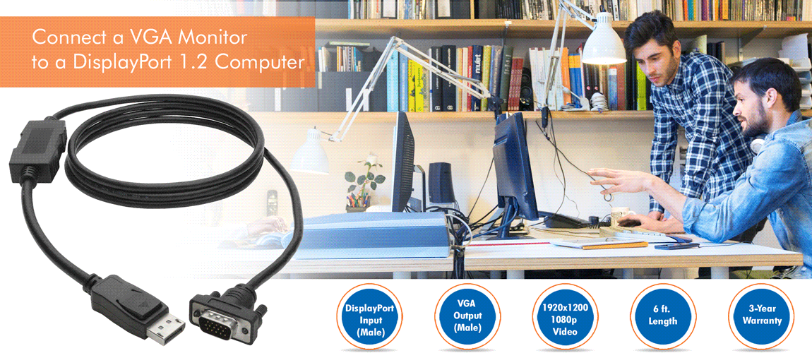 This 6 ft. adapter cable allows you to connect a computer or laptop with DisplayPort 1.2 video output to a VGA monitor. Simply plug the cable into your DisplayPort computer and your VGA monitor. You don’t need a separate adapter or device cable.