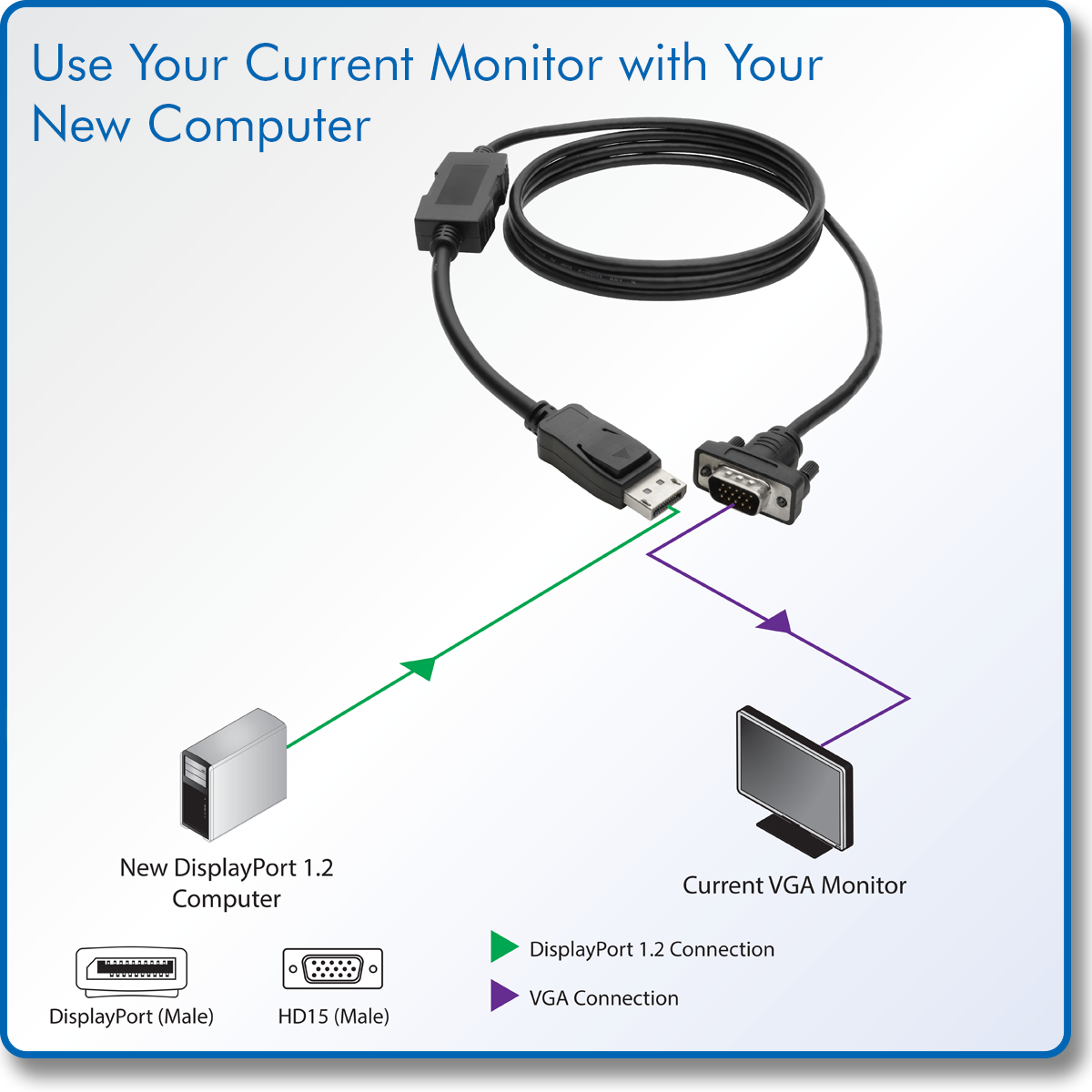 This adapter cable helps you save money by making your current VGA monitor compatible with a DisplayPort-equipped computer. Active digital-to-analog circuitry, premium double shielding and quality manufacturing ensure a clean, consistent video signal.