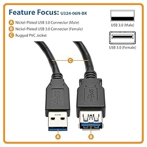 Backward compatible with earlier USB generations, the U324-06N-BK features premium foil and braid shielding to deliver reliable, error-free signal quality and protection from EMI/RFI interference. Molded nickel-plated connectors ensure excellent conductivity. Integral strain relief ensures the cable and connectors last a long time. A rugged PVC jacket protects twisted 28 AWG data lines and 24 AWG power lines.