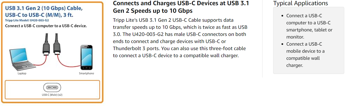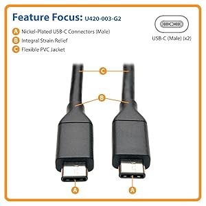 USB-C connectors have a slim profile that’s one-third the size of USB Type-A plugs. This allows the USB-C connector to fit on smaller, thinner devices like smartphones. But don’t let the small size deceive you, the USB-C connectors are powerful enough to connect peripherals to laptops and tablets. The U420-003-G2 delivers up to 3 amps for fast charging of mobile devices.