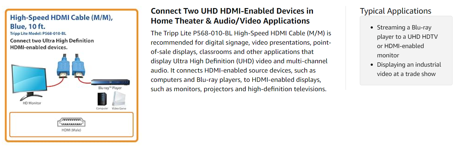 This cable supports UHD video resolutions up to 3840 x 2160 (4K x 2K), including full 1080p, and data transfer speeds up to 18.0 Gbps—the fastest bandwidth currently available over HDMI. When used with an Apple digital A/V adapter, it supports iPad2 video mirroring for playing games, watching videos or displaying presentations. Backward compatible with previous HDMI generations, the P568-010-BL works in all HDMI cabling scenarios.