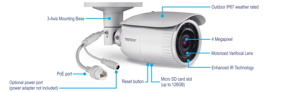 PoE offers cost savings and flexibility to install this outdoor varifocal surveillance camera up to 328.1 ft (328 ft) from the PoE source equipment.