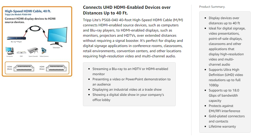 This 40-foot molded 28 AWG cable features premium foil-and-braid shielding as well as paired video wire construction to deliver top-of-the-line signal quality and protection from EMI/RFI interference. Gold-plated HDMI connectors with gold-plated copper contacts ensure excellent conductivity. Integral strain relief guarantees long life and durability.