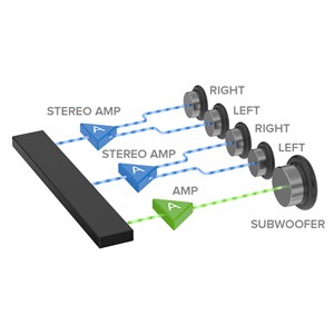The Katana houses a 5-driver design - two up-firing midbass drivers and two high-excursion tweeters in the soundbar, and one long-throw driver in its subwoofer. Each driver is individually chambered and powered by a DSP-controlled amplifier to deliver ultra-precise audio.