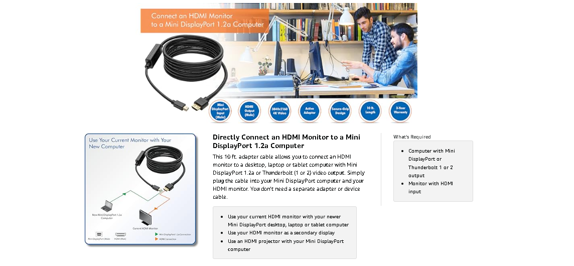 This active adapter cable helps you save money by making your current HDMI monitor compatible with a Mini DisplayPort-equipped computer. High-quality connectors provide maximum conductivity to ensure a clean, consistent video signal.