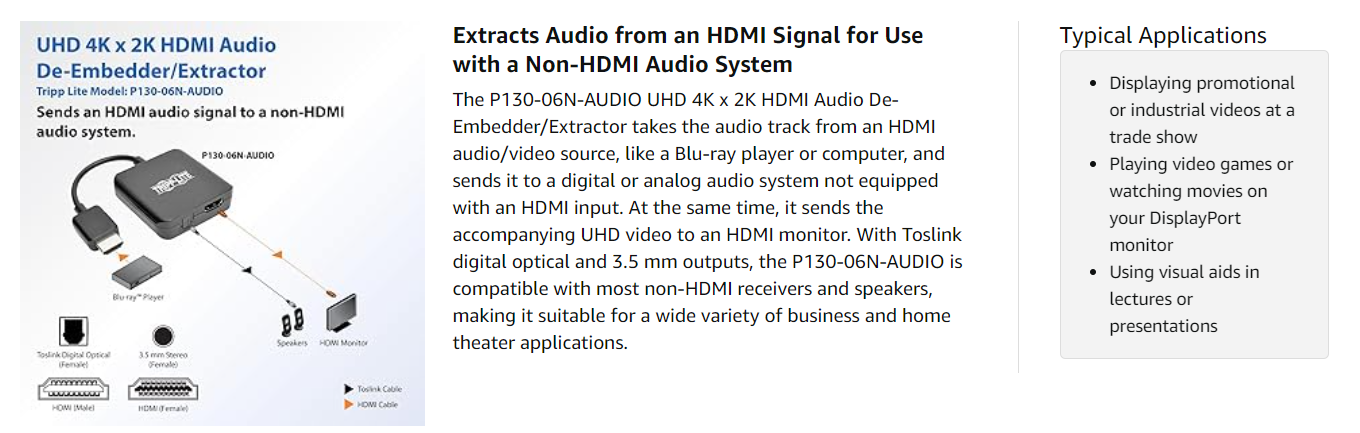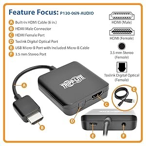 The bus-powered P130-06N-AUDIO is easy to set up and use. Simply connect the built-in 6-inch HDMI cable to your source, then use the included USB Micro-B cable to connect the Micro-B port to the USB port on your HDMI source or USB charger. Next, use a high-speed HDMI cable, like Tripp Lite’s P568-series (sold separately), to connect the unit to an HDMI monitor. Finally, use an appropriate cable and the unit’s 3.5 mm stereo or Toslink port to connect to a compatible audio system.
