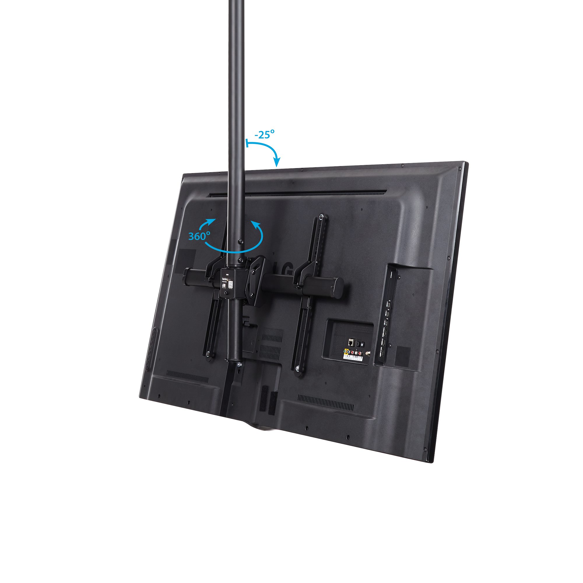 You can adjust your TV to create a comfortable viewing angle, by tilting it up to -25 degrees down towards your audience for optimum visibility. Plus, the full-motion mount lets you swivel your display around the pole + 180 / - 180 degrees, without using tools.