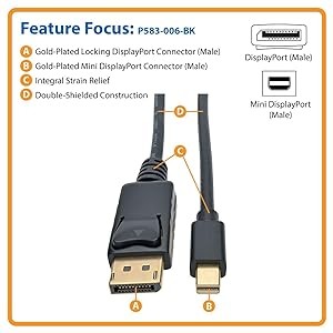 This black, 6-foot cable meets DisplayPort 1.2 specifications and is backward compatible with previous DisplayPort versions. With premium foil-and-braid shielding, it delivers reliable, error-free signal quality and protection from EMI/RFI interference. Gold-plated connectors and contacts ensure excellent conductivity. Integral strain relief provides flexibility so the cable and connectors can move freely without cracking. To prevent accidental disconnection from a monitor, the P583-006-BK features a locking DisplayPort connector.