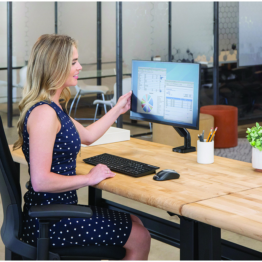 Increase valuable desk space and easily adjust your monitor to reduce eye, neck and shoulder strain. Connect your favorite devices with 2 USB ports conveniently located at the base of the product. Features easy and effortless monitor adjustment with innovative gas spring technology. Adjustable arm easily lifts monitor up and down through a 15” height range. Mounts via clamp or grommet. Minimize clutter with the intuitive cord management system. Holds a monitor up to 30”/20 lbs. Meets VESA mounting standards.