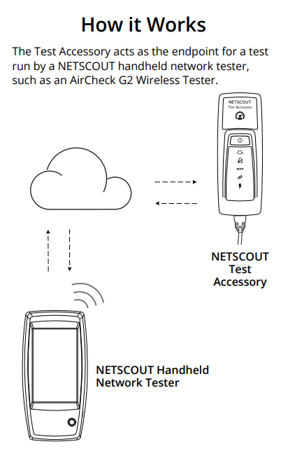 It is now easier and faster than ever to verify that your network can support the bandwidth required for Voice over Wi-Fi, Video Streaming, Data Transfers and more. The NETSCOUT Test Accessory works together with various NETSCOUT Handheld Network Testers to run network performance and availability tests. Just plug your Test Accessory anywhere on your network, take your AirCheck G2 Wireless Tester or OneTouch AT Network Assistant to the area on which you want to run your performance test, and in a matter of seconds, you will be able to measure both your upload and download throughput speeds. No need for complicated and time-consuming setups, and no need to depend on unreliable internet speed tests that could provide inaccurate bandwidth information. Testing, troubleshooting, and verifying performance on your network has never been easier!