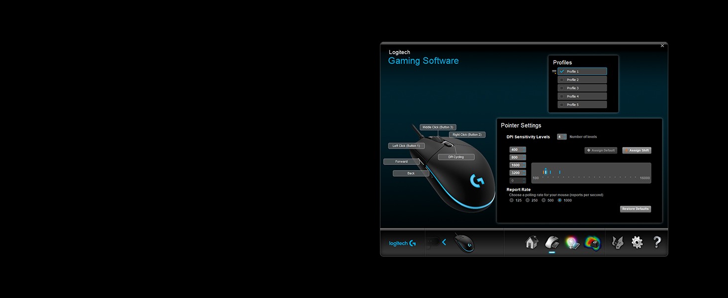 Customize PRO gaming mouse for the way you play and games you play. Use Logitech Gaming Software to setup lighting profiles and program buttons with one-click macro commands, DPI shifting and more.