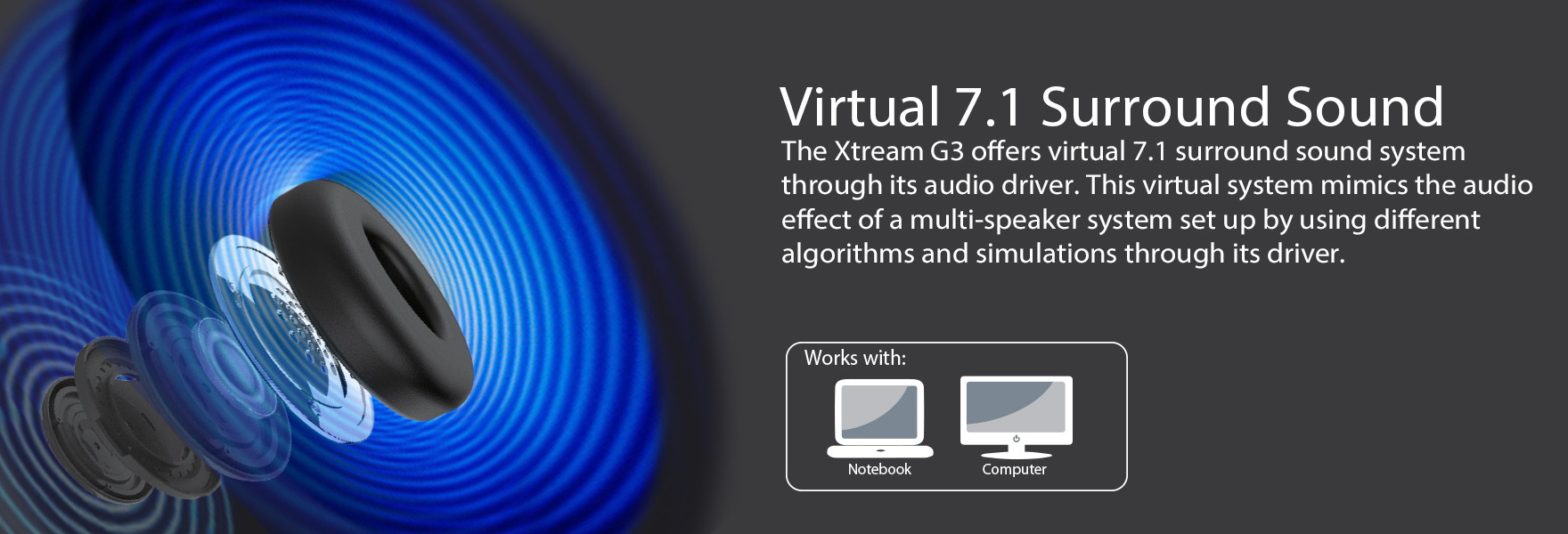The Xtream G3 offers virtual 7.1 surround sound system through its audio driver. This virtual system mimics the audio effect of a multi-speaker system set up by using different algorithms and simulations through its driver.