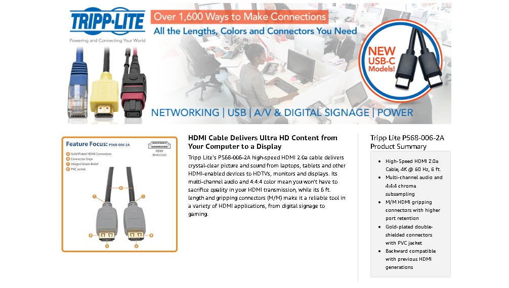 The P568-006-2A’s specially-designed high-grip plugs have greater port retention than typical HDMI connectors, helping them resist the vibrations that can loosen them over time. This will keep your presentations, games and movies safer from signal disruptions - especially important when the cable is in a difficult-to-access location. The grippers also protect against accidental disconnection from tripping or other contact that might happen in high-traffic locations like trade show floors or retail spaces.