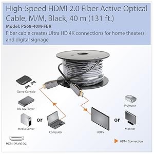 This 4K-capable cable securely connects HDMI-enabled laptops, tablets, PCs, Blu-ray players, game consoles or satellite/cable TV boxes to HDTVs, HD monitors, projectors or home theater receivers. Because the P568-40M-FBR uses optical fiber, it can transmit HDMI signals longer distances with no latency or loss. It also eliminates any EMI/RFI line noise that can interfere with your audio/video signal and disrupt the performance of your connected equipment.