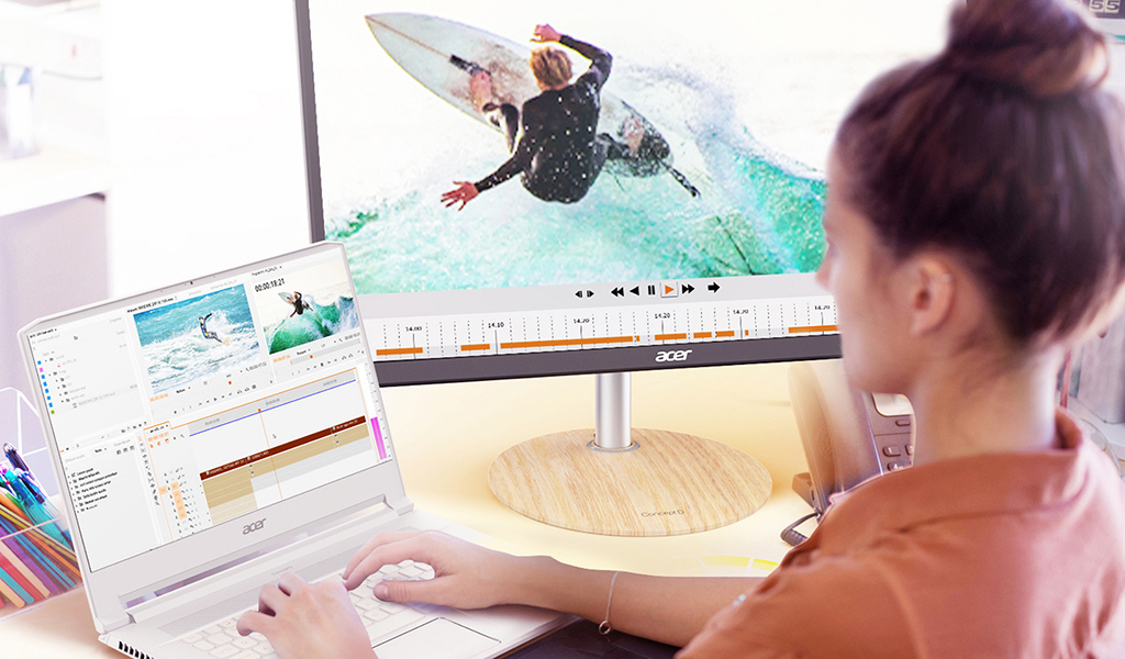 Whether you’re designing in 3D or 2D, you’ll appreciate the ConceptD 7’s speed and multi-tasking prowess. The chassis houses a 9th Gen Intel® Core™ i7 processor2, an NVIDIA® GeForce RTX™ 2080 with Max-Q design2, up to 32GB of DDR4, and up to 1TB2 PCIe NVMe SSDs in Raid 02. Get faster real-time preview while video editing, or smoothly export and render up to 6K video files and simple 3D designs.