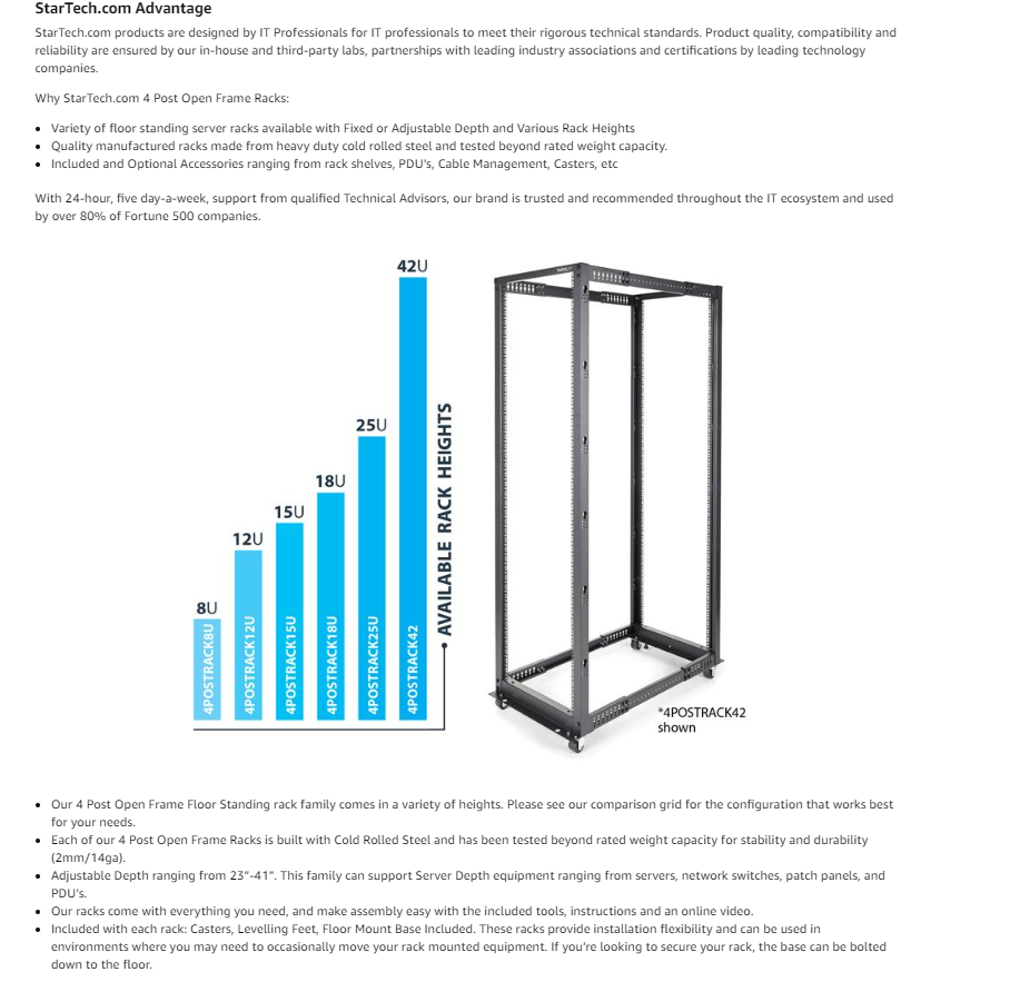 StarTech.com 8U 19" Open Frame Server Rack - Compact, 4 Post, Adjustable Depth (22 to 40") - Mobile Network Rack - HP ProLiant ThinkServer