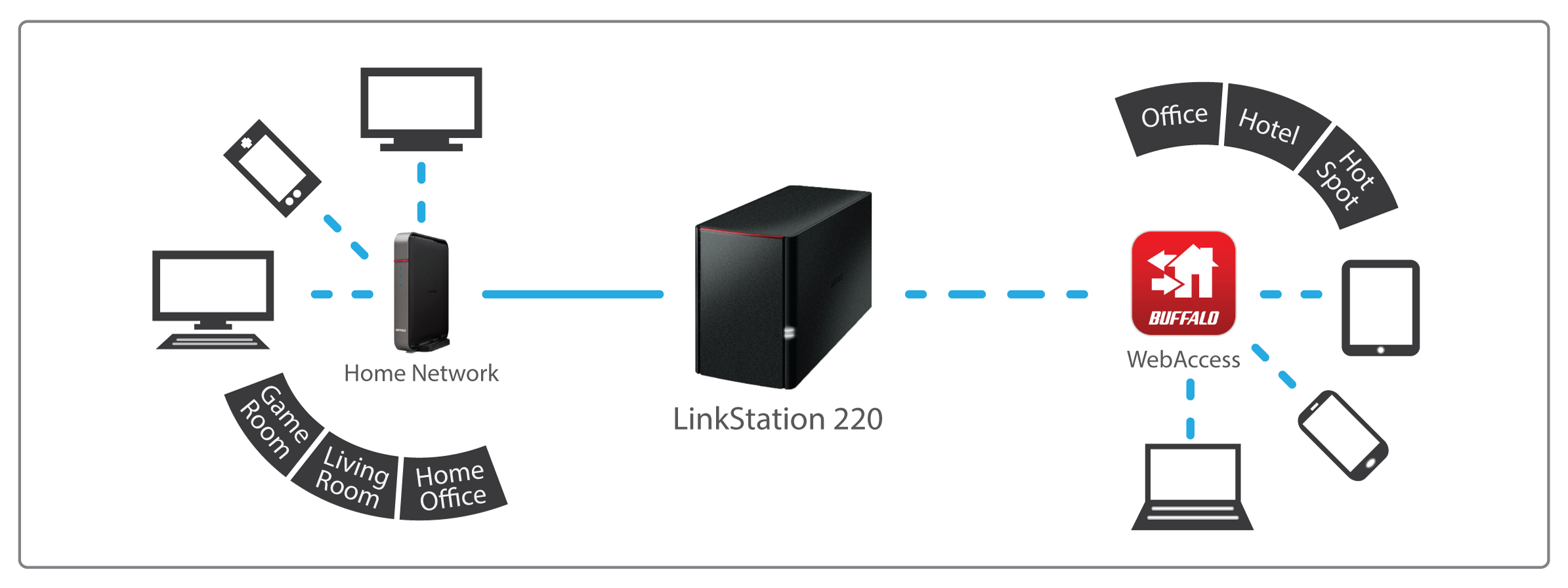 While on the go, Buffalo's free WebAccess service allows you to create a personal cloud for easy remote access and file sharing with anyone, anywhere over the Internet. Your data remains securely stored in one place on your home or small office network, but you can access it quickly from any computer, tablet or smartphone device over the Web.