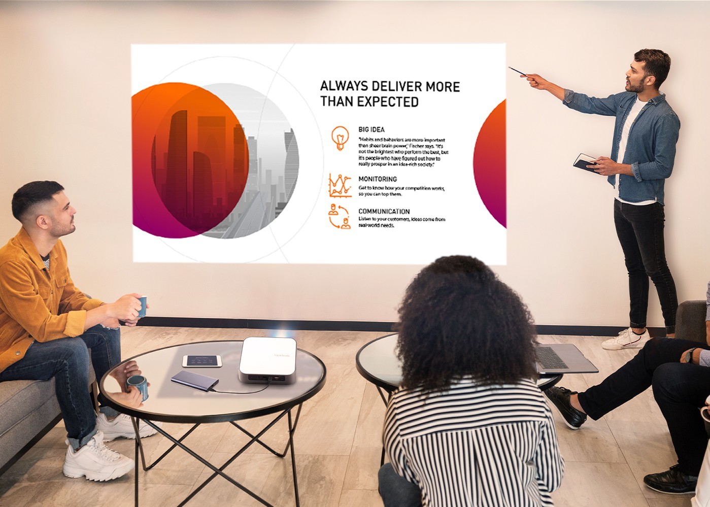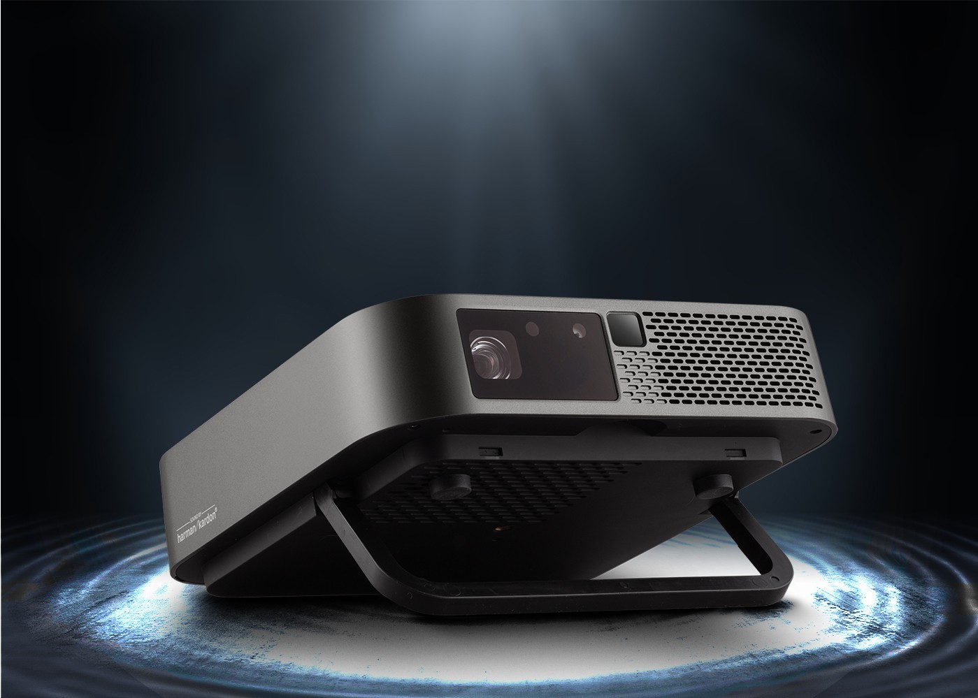 Integrated Harman Kardon speakers deliver powerful performance in a small package. These premium speakers produce deep, loud, 360-degree room-filling sound perfect for music and movies. Bluetooth in/out capabilities mean you can use the projector as a Bluetooth speaker, or output the audio from the projector to your Bluetooth headphones.