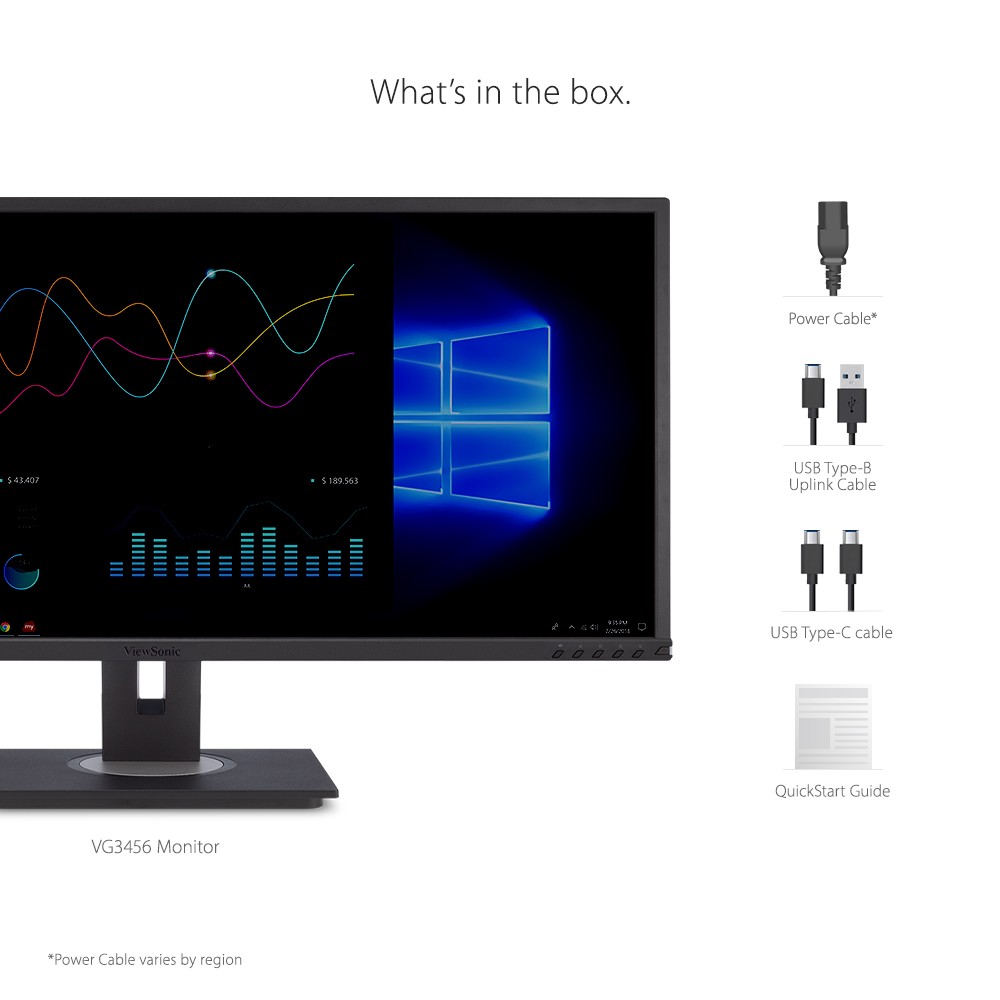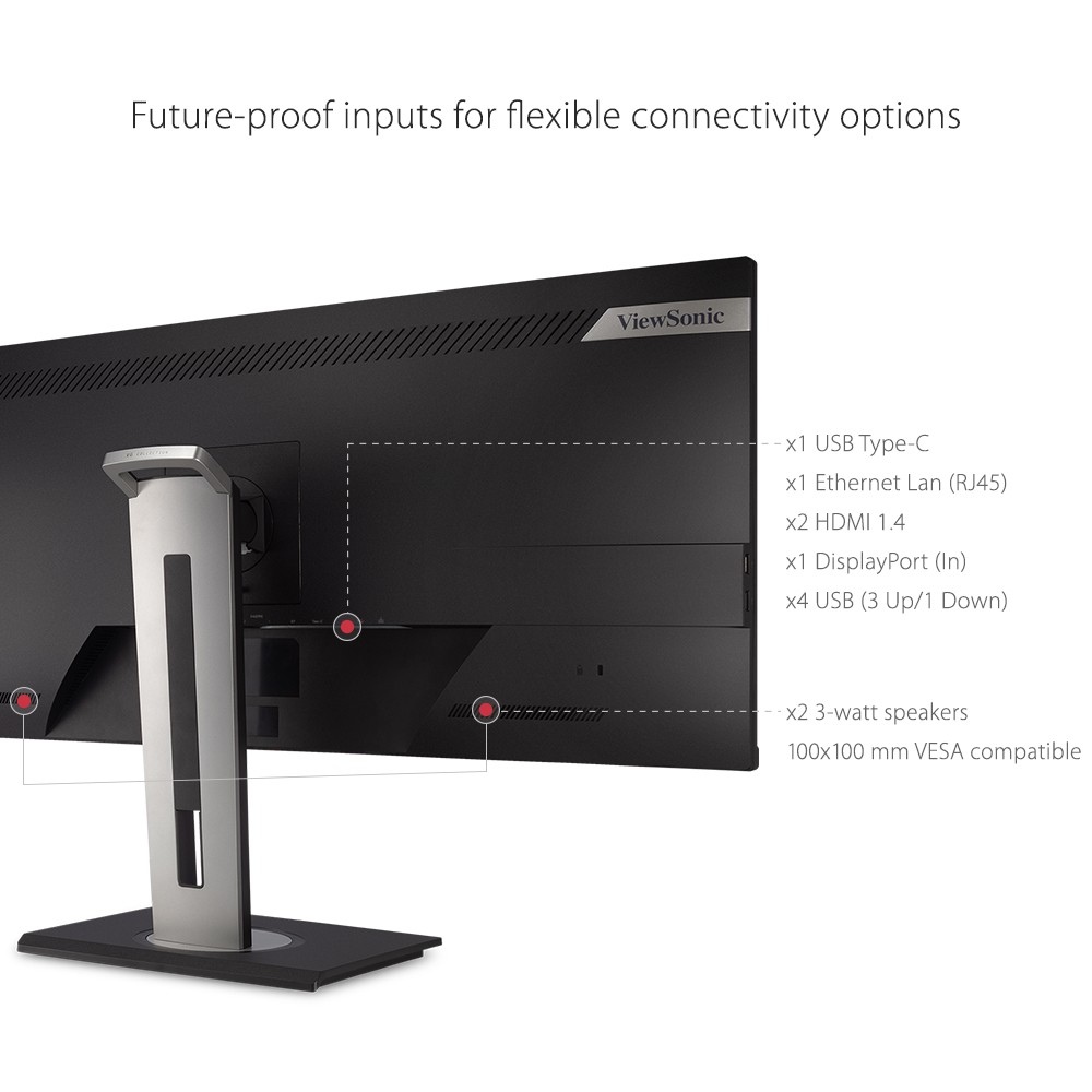 Featuring an ultra-wide 34” screen with a design to boost productivity and maximize output, the ViewSonic ® VG3456 is a docking monitor that transforms your desktop into a streamlined and efficient workspace. With WQHD 3440 x 1440 resolution, the VG3456 delivers 2.4 times more pixels than standard Full HD monitors, giving users more detail for enhanced productivity. A 21:9 aspect ratio and slim bezels provide extra screen real estate so users can display more content, switch between applications more quickly, view documents side by side, and view multiple windows at once. Enjoy reliable and flexible network connectivity with the integrated gigabit Ethernet port while the latest USB Type-C connectivity provides up to 90W power delivery to your laptop. That’s not all, the integrated USB hub also provides single-cable simplicity for connecting and charging your peripherals and accessories. In addition, the included vDisplayManager software gives you quick and easy OSD control, as well as customized screen templates for easy multi-tasking. This monitor is also shipped in eco-friendly biodegradable packaging, along with an easy-to-install quick release stand that makes for quick deployment and a lower total cost of ownership.