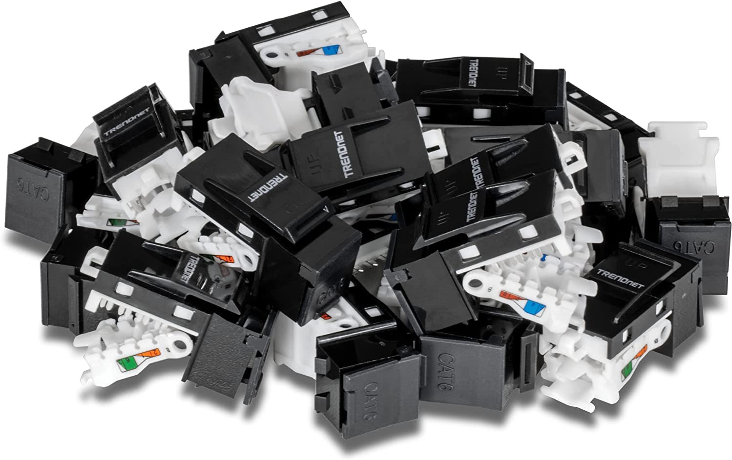 TRENDnet’s Cat6 Keystone Jack – 25-Pack, model TC-K25C6, includes twenty-five Cat6 keystone jacks for use with TRENDnet’s TC-KP24 or TC-KP48 blank keystone patch panel. Each keystone jack provides up to 10Gbps speeds over 55m (180 ft.) of Cat6 Ethernet cabling. These Cat6 keystone jacks feature a convenient tool-less design with wire separation for easy cable termination.