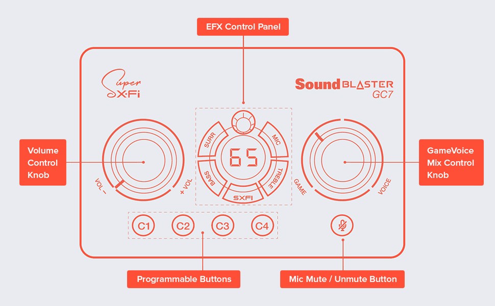 Sound Blaster GC7 is designed for simple and intuitive one-handed controls, allowing you to access all the necessary adjustments at your fingertips. Save your presets and shortcuts on the programmable buttons and access them easily as and when you need to. Whether it’s to switch to a specific audio setting or launch a third-party application, the control is just a button away.
