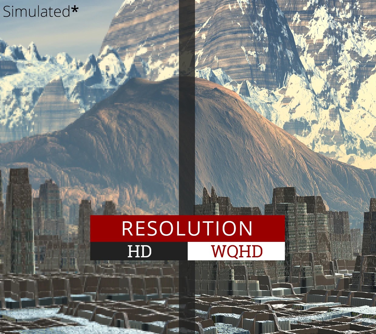 At four times the resolution of a traditional 720p panel, and almost double that of a traditional 1080p display, WQHD results in a much sharper image, with no distortion or stretching, all while maintaining the same 16:9 aspect ratio. WQHD resolution also provides up to 77% more screen space for a more immersive experience.