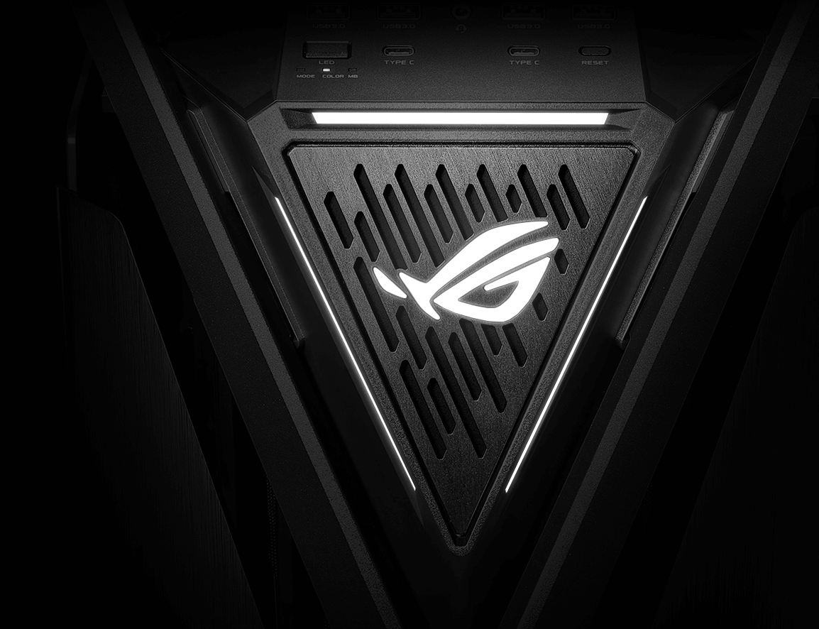 The front of any ROG chassis has to offer a host of connectors, and the ROG Hyperion adds to the tradition with two USB Type-C ® connectors that can offer up to 20 Gbps of data transfer and up 60 watts of fast charging with a compatible motherboard.