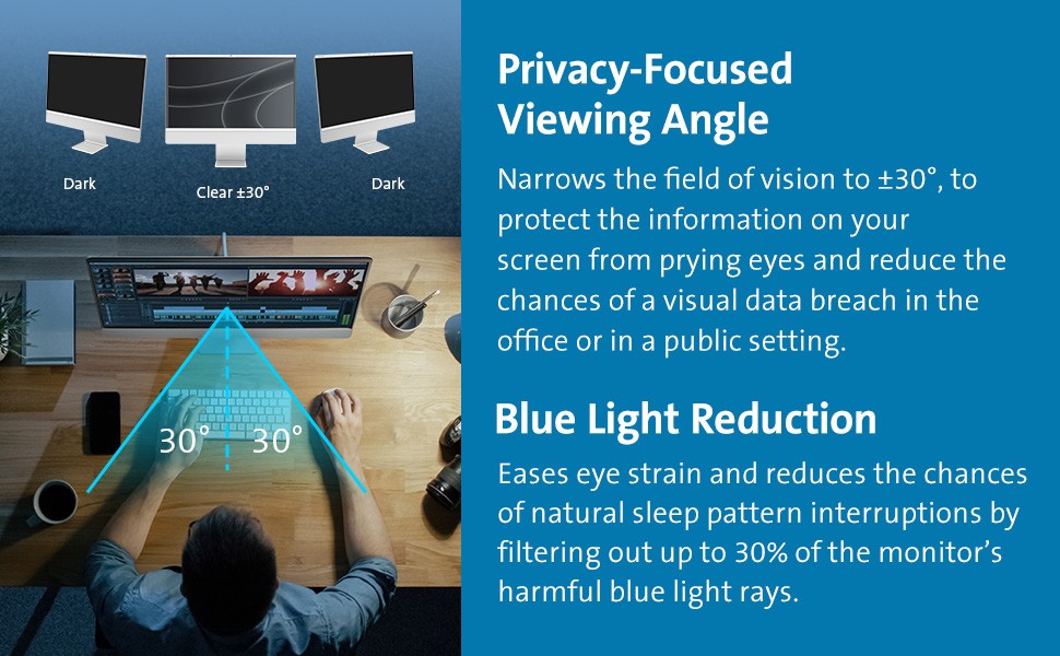 ● Privacy-focused viewing angle narrows the field of vision to ±30°