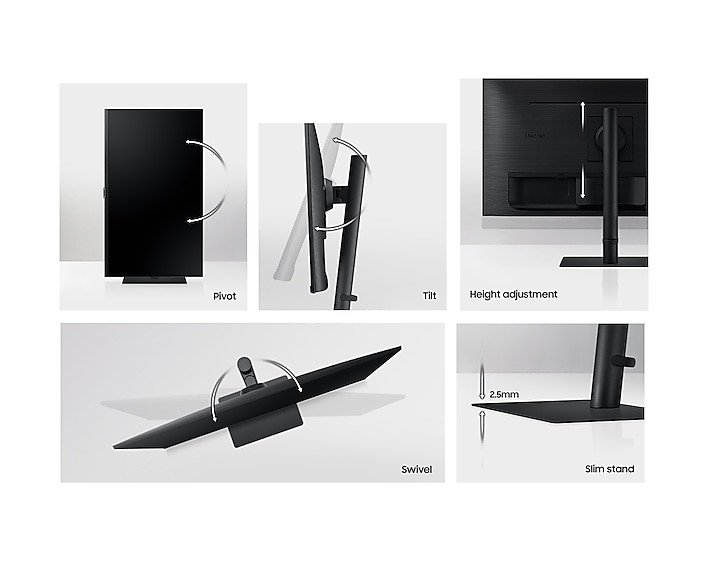 Find a monitor position that maximizes your comfort. Pivot the screen from portrait to landscape or adjust up and down for the perfect height. Then tilt and swivel to capture the best viewing angle. The slim metal stand with narrow depth takes up less desk space for a clean, seamless work setup.
