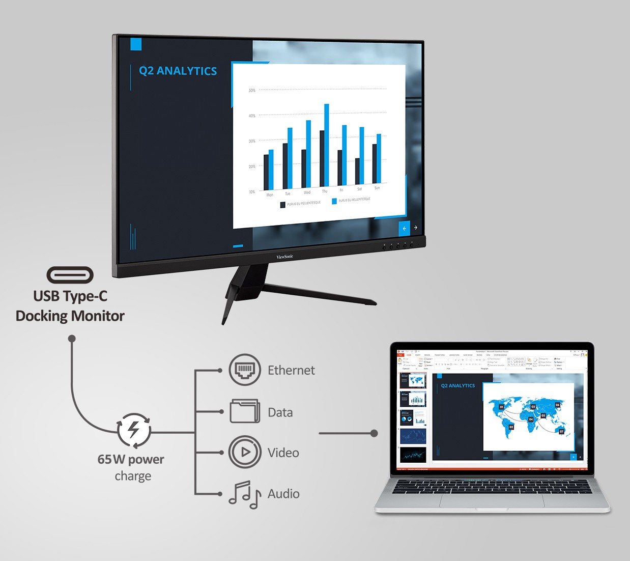 With a slim and reversible connector, USB 3.2 Type-C connectivity reduces the reliance on multiple wires, cables, and adapters. In addition to audio and video transfer, USB Type-C also provides quick 65W charging over a single cable.