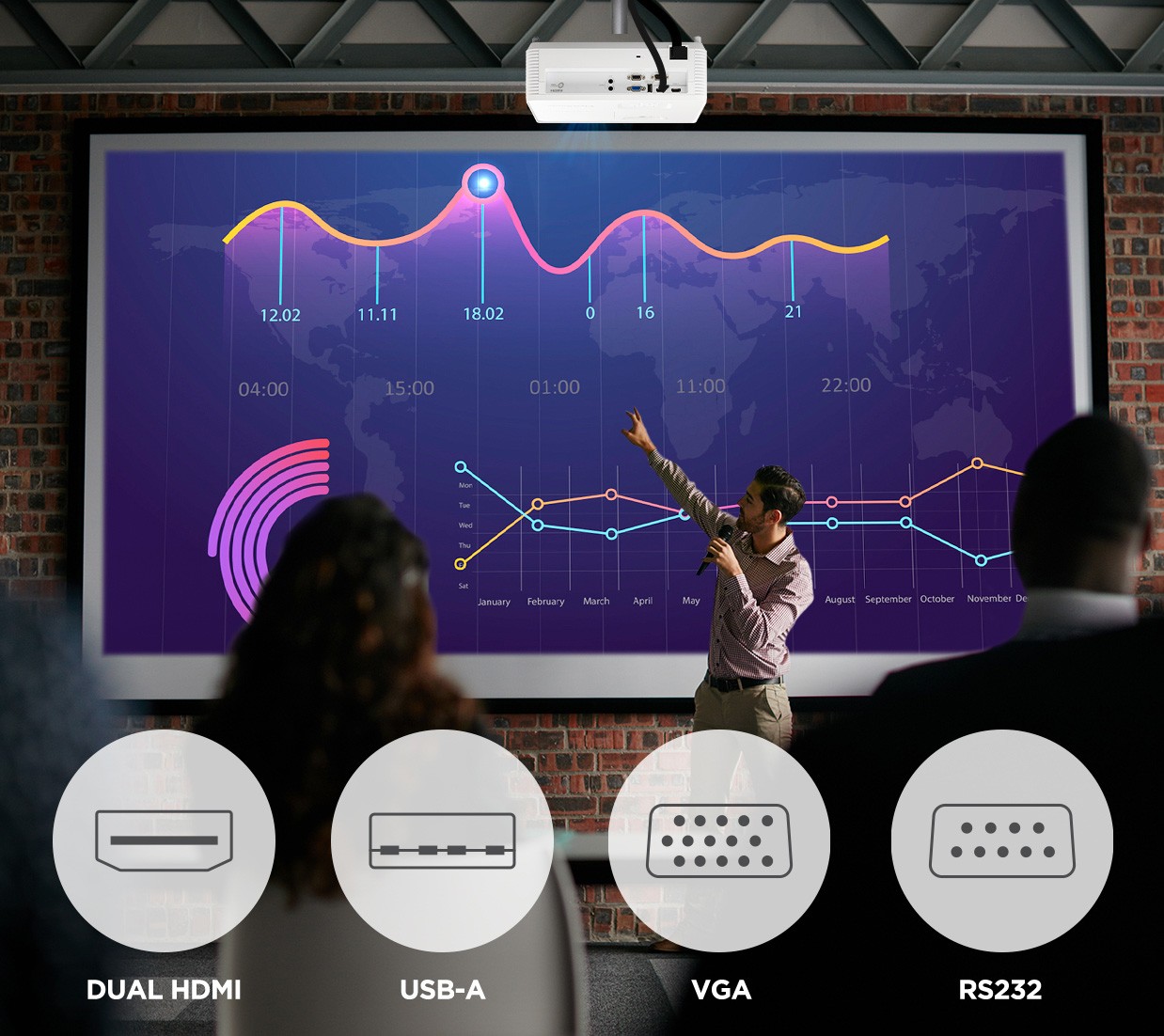 The PS502W projector also comes with multiple connectivity options for greater convenience. Dual HDMI ports empower users to connect multiple devices directly to the projector. Once connected, the projector can conveniently switch between different input sources at the press of a button. A USB-A port provides power to wireless HDMI dongles for a more convenient streaming experience. Rather than taking your projector to the service center, software updates can be performed easily over a simple USB cable.