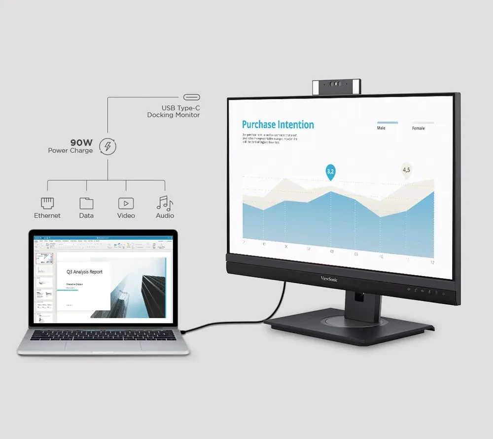 This monitor simplifies your workspace by replacing your docking station. It uses one USB-C cable for data, audio, video and 90W power delivery. The built-in RJ45 Ethernet enables wired network connectivity, the USB hub allows easy connection to peripherals, and an extra USB-C port with 15W power delivers convenient phone charging.