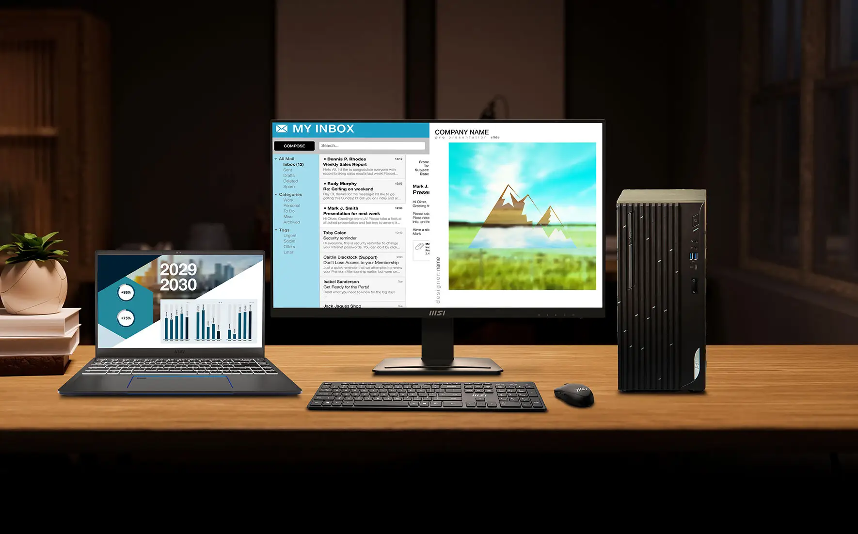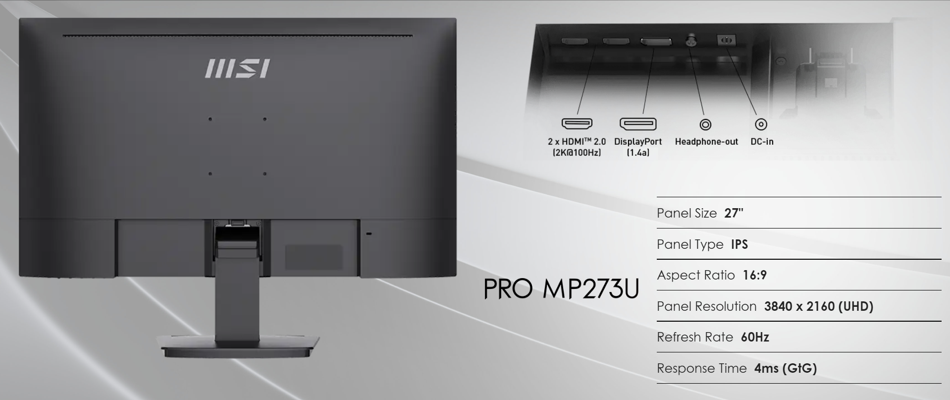 With several practical designs including standard VESA Mount, Built-in Speakers, Stand with an accessory slot and complete I/O ports, the PRO MP273U Series is the caring assistant that boosts your productivity