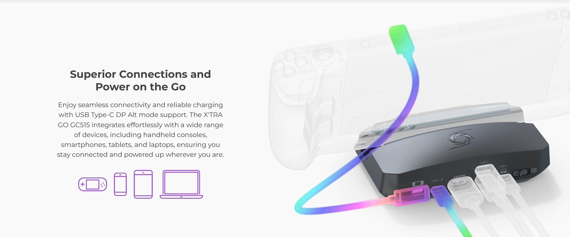 Your Essentials Go AnywhereThe X’TRA GO GC515 enables effortless one-click recording of gaming, multimedia, and entertainment content while keeping your devices charged. It also doubles as a docking station, offering a stable platform for your device. Whether you're creating content, gaming, or working on the go, the GC515 ensures uninterrupted power, focus, and convenience.